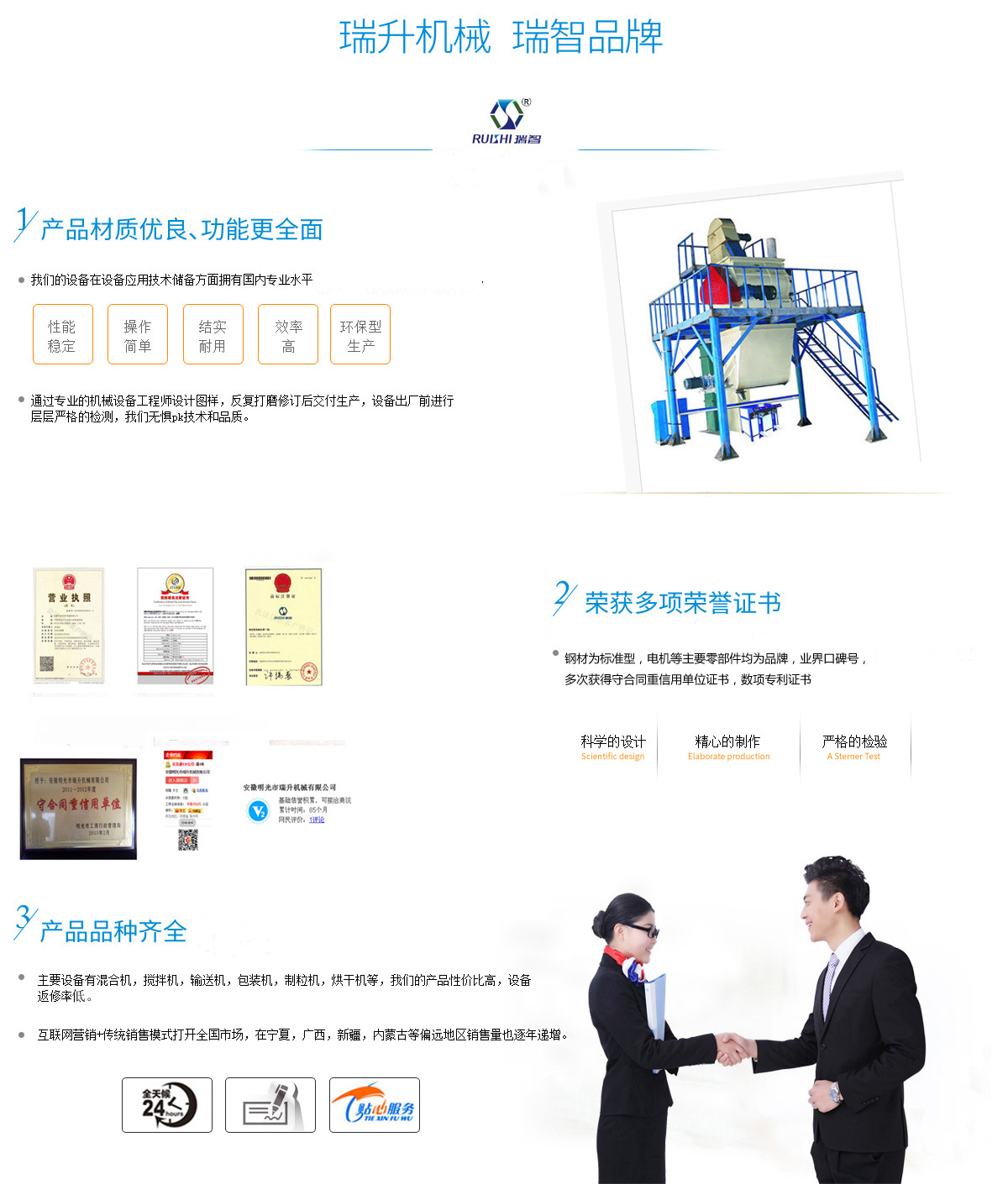 安徽瑞升機(jī)械制造有限公司坐落在明光市工業(yè)園區(qū),本公司產(chǎn)品主要用于粉料物質(zhì),顆粒物質(zhì)的混合、攪拌、輸送、包裝的自動(dòng)化生產(chǎn)設(shè)備。工廠占地面積為1萬多平方現(xiàn)有6000平方米的生產(chǎn)車間和各類加工檢測(cè)設(shè)備,具備產(chǎn)品開發(fā)、研制、設(shè)計(jì)、生產(chǎn)、試驗(yàn)、倉儲(chǔ)運(yùn)輸?shù)饶芰?,可以生產(chǎn)多種規(guī)格、多種非標(biāo)定制的產(chǎn)品,并有多項(xiàng)技術(shù)獲得國家專利,擁有自主進(jìn)出口權(quán),公司憑借優(yōu)良的技術(shù)、先進(jìn)的工藝和科學(xué)的管理理念,所生產(chǎn)的產(chǎn)品已暢銷全國各地,部分產(chǎn)品已進(jìn)入馬耳他、印度尼西亞、韓國、羅馬尼亞、沙特阿拉伯、馬來西亞、印度、巴基斯坦、等國家和地區(qū),受到國內(nèi)外客戶的高度認(rèn)可和信賴。 本公司獲得守合同重信用單位證書,對(duì)原材料的采購極為細(xì)致,鋼材為標(biāo)準(zhǔn)型,電機(jī)等主要零部件均為品牌,數(shù)項(xiàng)專利證書。技術(shù)方面我司擁有一支國內(nèi)的技術(shù)和管理團(tuán)隊(duì),在機(jī)械設(shè)備應(yīng)用...公司資質(zhì)榮譽(yù)